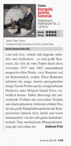„Tassilo Probst besticht durch seine subtile Phrasierung des Violinkonzertes, mit der er den Zuhörer in die nachdenklichen, Wehmütigen Melodien hineinzieht“